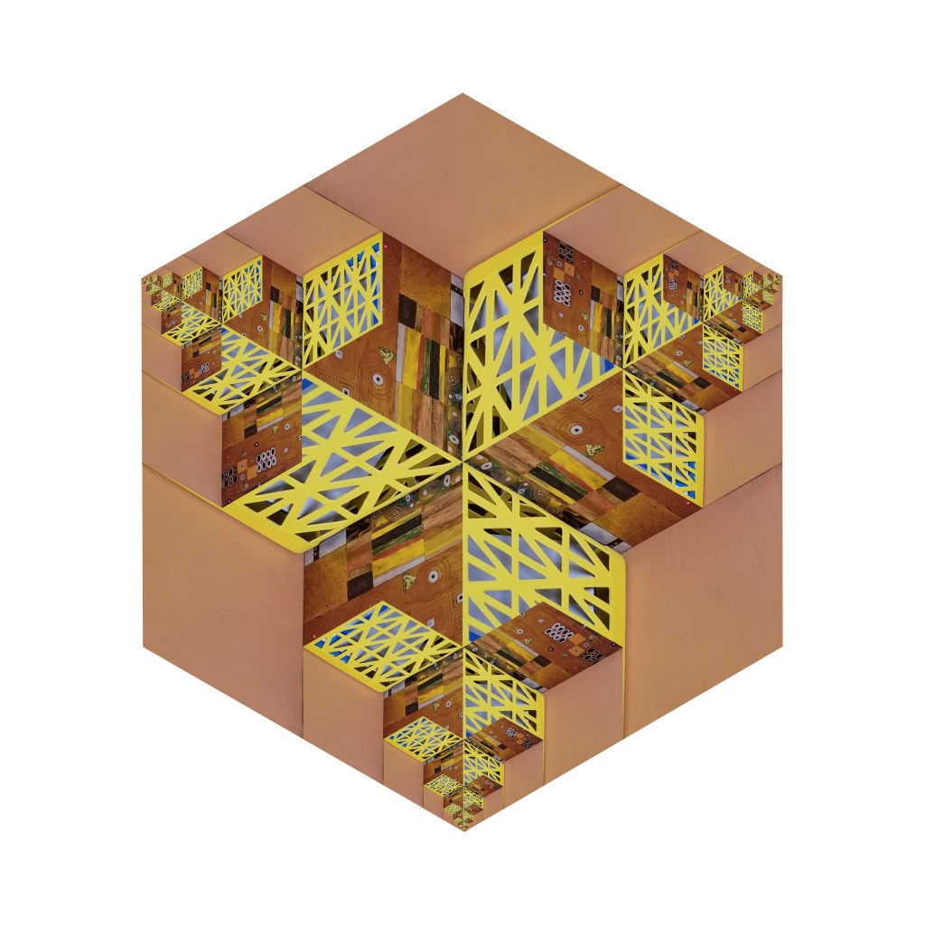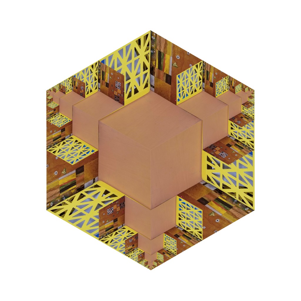 Imaginary wooden center cube. Tiles by Jessica Rivera McGlothin, Jamie Fair, and Jim Izzy Israel