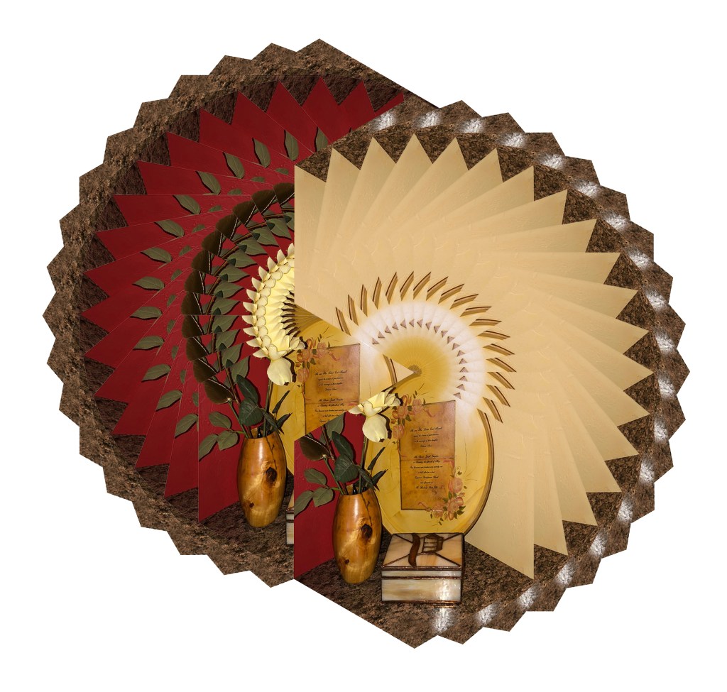 Imaginary reddish center cube. Tiles by Brian Jack, Gregory Usberti, and Laurel Mitchell