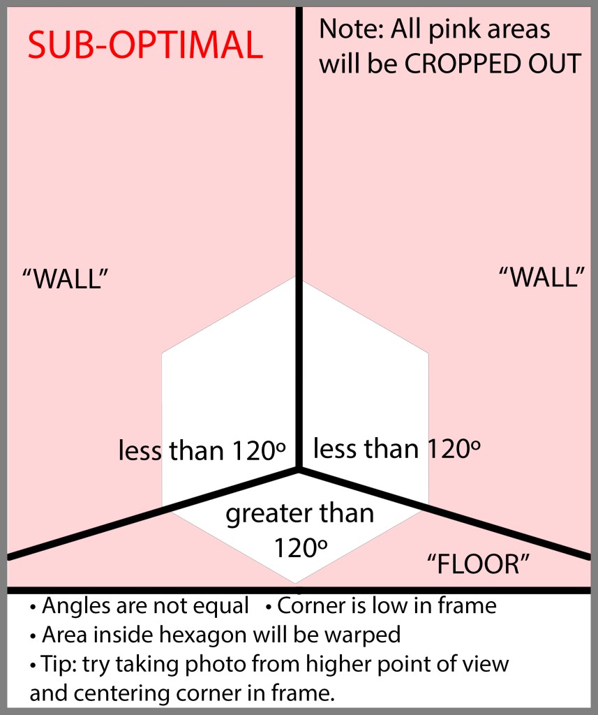 The most important consideration when taking pictures for the Corners Project is the geometry of your shot. The vertex of the corner should be in the center of your frame, and the three angles which comprise the vertex should all be as close as possible to 120º. I can fix most angles, but the resulting image will be warped. The more off the angles in the raw photo, the more warped the image in the hexagonal tile/cube will be.