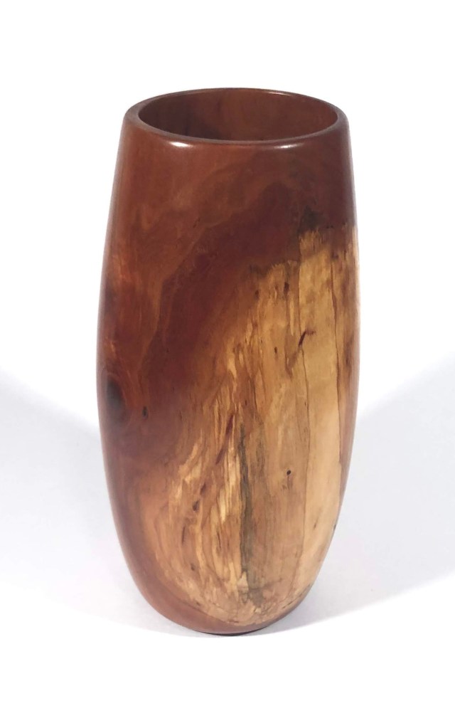Vase – 2004 – cherry – 10.625” x 5” x 5” – Steve happened upon a great batch of cherry firewood, and he made a series of beautiful vases from it. This particular vase was a wedding gift from dad to me and my wife, Katie Palumbo. (Catalog #006)