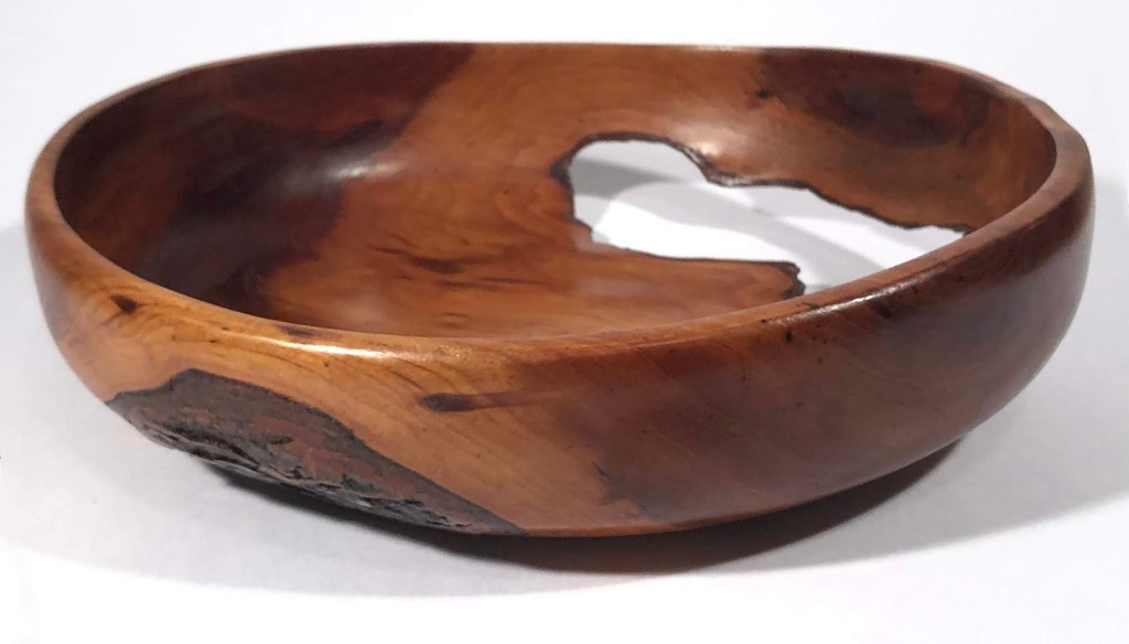 Bowl – (2000s) – cherry – 3” x 12.375” x 12.25” – Steve made a series of such low profile bowls with voids. They often have a very complimentary warped shape. (Catalog #010)