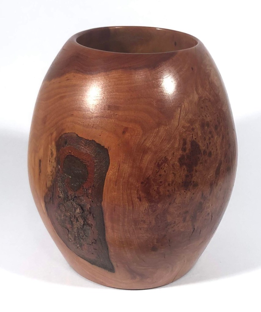 Vase – 2004 – cherry – 9.5” x 8.25” x 7” – Eventually, Steve obtained several lathes and was able to work on larger pieces. This is another example of his combining simple form with existing natural attributes. (Catalog #004)